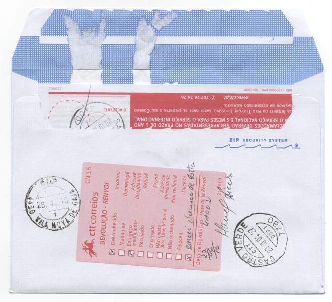 Observação: sendo o remetente e o destinatário a mesma pessoa o carteiro entregou o objecto postal tal e qual como o recebeu, não carecendo de assinatura!