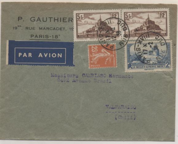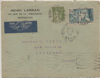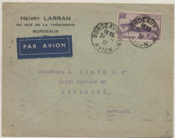 Carta Circulada por correio aéreo Bordeaux 24.05.1937 -- > Marseille 25.05.1937 -- > Lisboa 27.05.1937.
