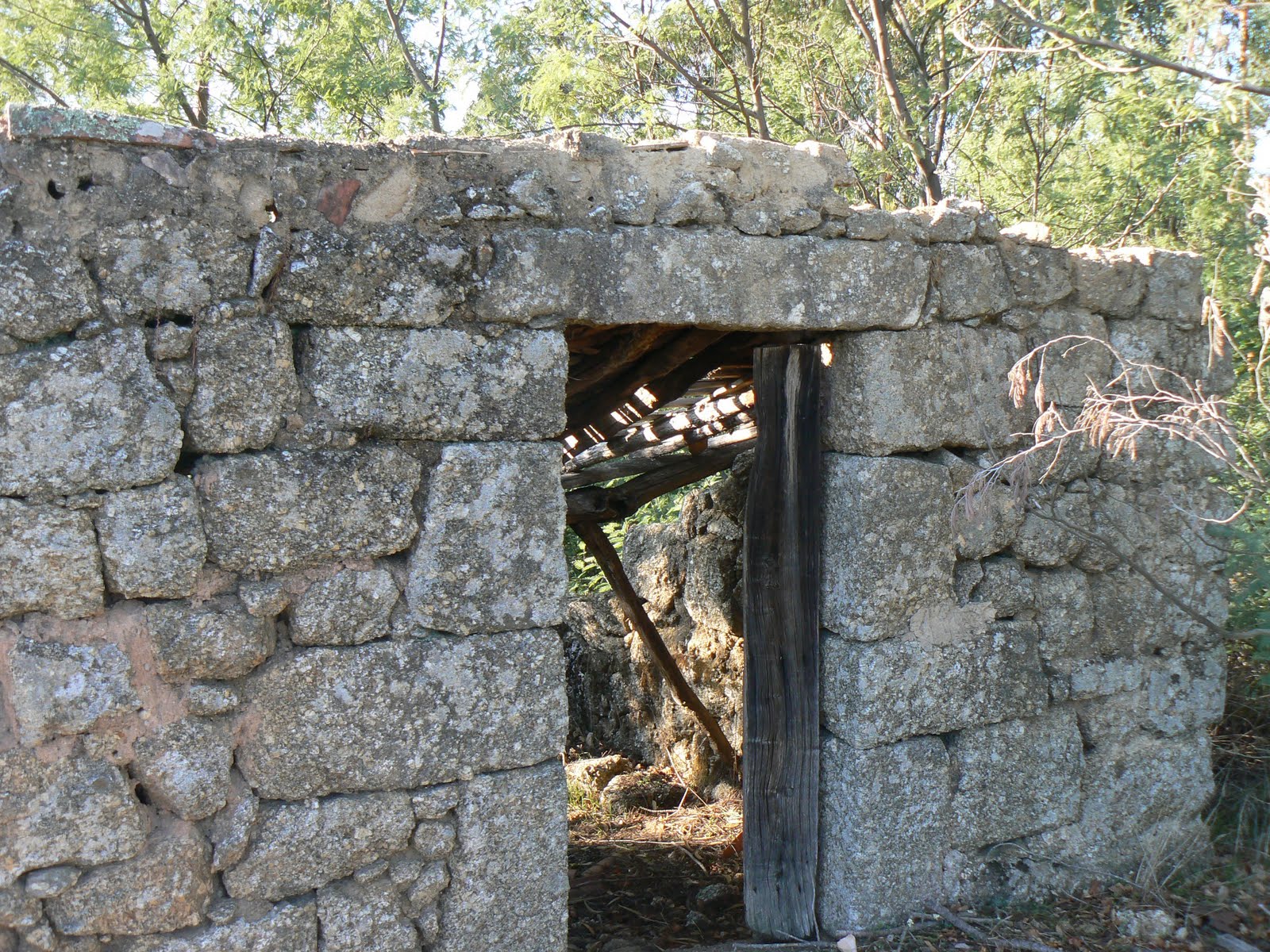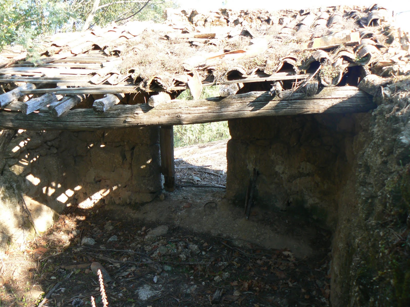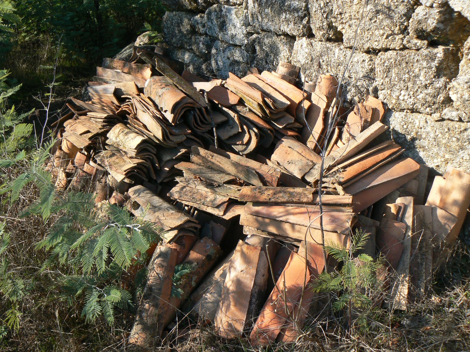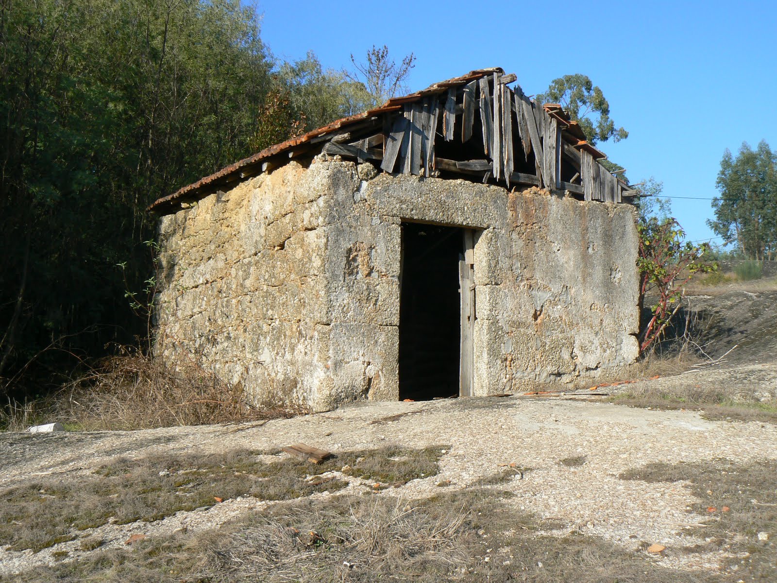 Ruínas de uma velha casa da eira coberta com telha canudo.