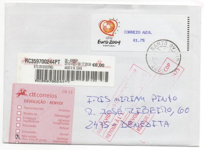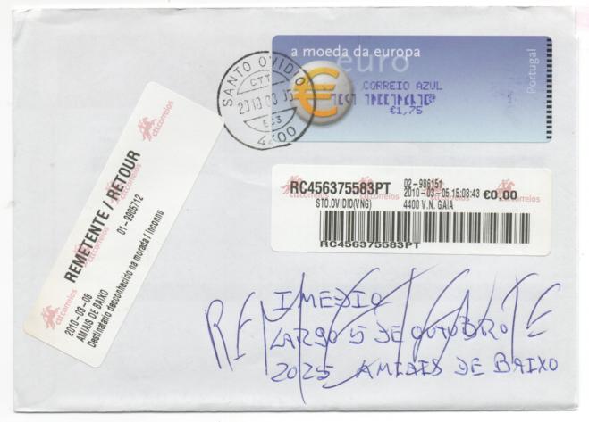 Carta aceite na EC Santo Ovídio em 08.03.2010 para Vila Nova de Gaia 09.03.2010, devolvida ao remetente por endereço fictício.