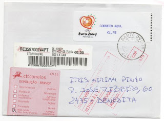 Carta aceite na EC de Santo Ovídio 08.03.2010 para Benedita 09.03.2010 e devolvida ao remetente por endereço fictício.