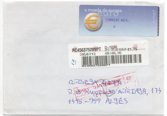 Carta aceite em Canelas 04.03.2010 enviada para endereço fictício em Algés - não recebeu a marca de aceitação, apenas a etiqueta de DEVOLUÇÃO.