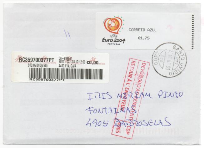 Carta enviada da EC de Santo Ovídio 08.03.2010 para Barroselas 09.03.2010, devolvida ao remetente por endereço fictício.