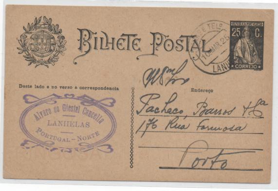 Circulado de Lanhellas em 10 de Março de 1925, para o Porto. Não tem marca de recepção.