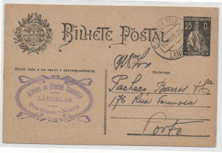 Inteiro postal com a taxa de 25 centavos, correspondente ao porte do bilhete postal simples, desde 14 de Fevereiro de 1924.