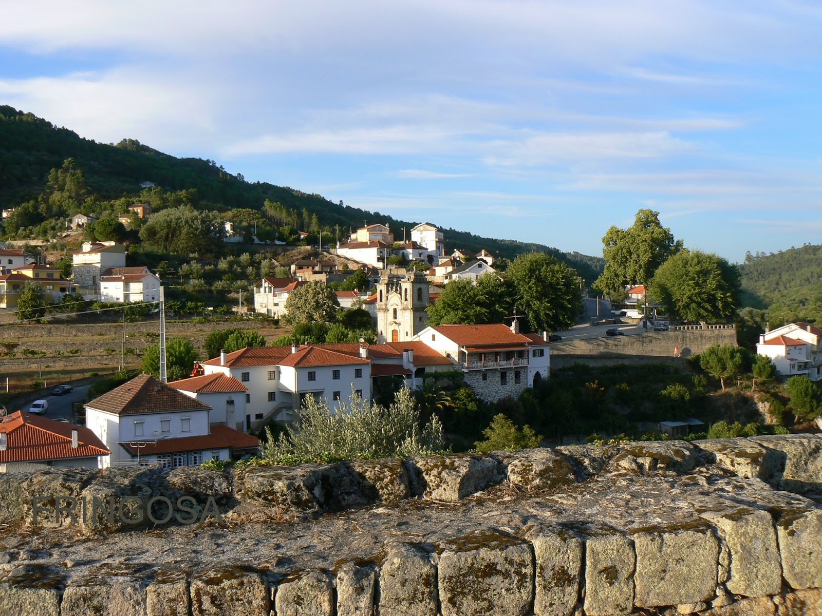 Situada na descida de um monte e dividida pelo rio Alva, sobre o qual tem uma excellente ponte de um só arco, de boa cantaria.