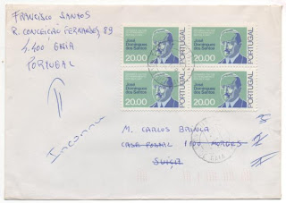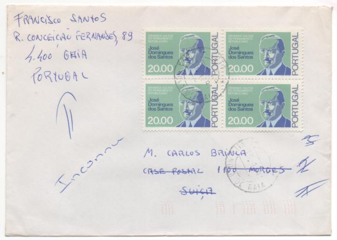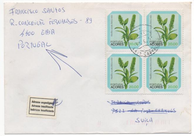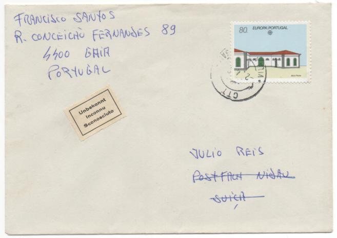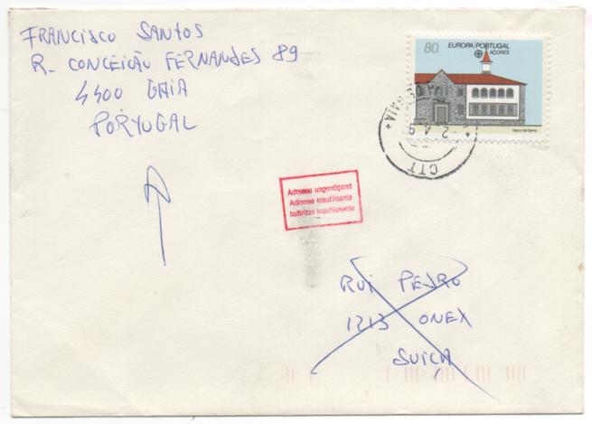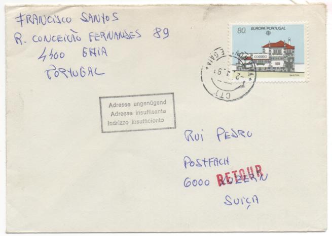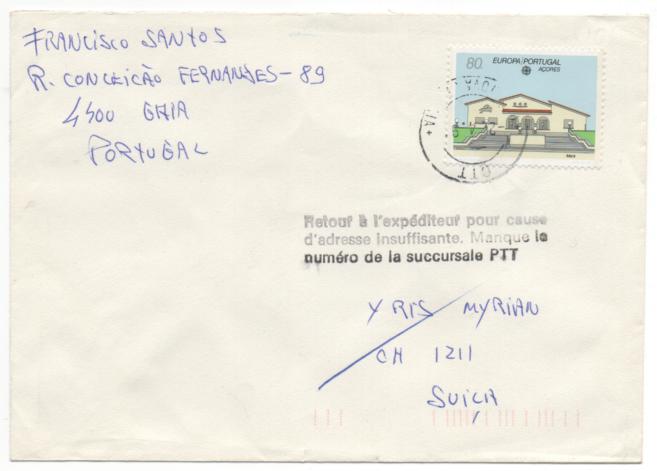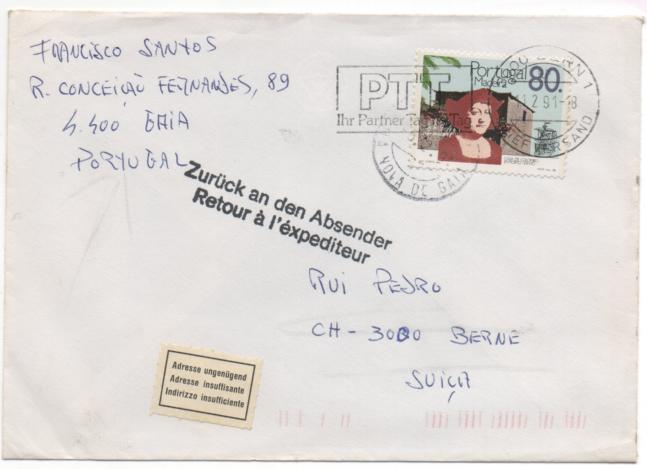 Enviada de Vila Nova de Gaia em 2-4-91 para a Suíça, apenas recebeu a marca de endereço insuficiente dos correios suíços. Foi devolvida e entregue ao remetente sem mais alguma marca de dia.