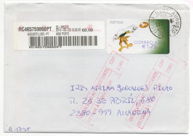 Carta circulada por correio azul, primeiro porte até 20 gramas, 0,45 + 0,02 = 0,47.