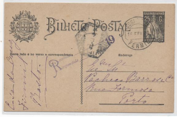 Inteiro postal com a taxa de 25 centavos, correspondente ao porte do bilhete postal simples, desde 14 de Fevereiro de 1924.