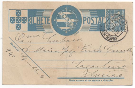 Inteiro postal enviado para Ancião em 23. Abril. 1940